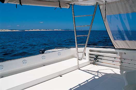 In short, there is a single bunk up forward in each sponson, with limited stowage in this area. Up on the deck — which can be totally enclosed in zipdown screens — and behind the forward glassed console is a huge, 21sqm living-cum-party-cum-fishing area. Rigged out for tropical cruising as a live-aboard craft with a 700 nautical mile range, this craft could take a fishing nut to paradise and allow him and his friends to have a wonderful holiday.