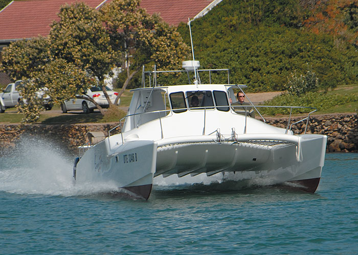 It is the latter that I will dwell on first. A major aspect of this craft’s performance is to understand — and get used to — the difference between the performance of a displacement hull (as used in the Supercat 38) and the planing hull of the conventional ski-boat we are familiar with. Indeed, we are all used to skimming over the water’s surface, but a displacement hull slices through the water, retaining its waterline depth throughout its performance.