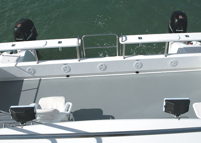 Supercat have moved the craft’s transom a lot further back to increase the size of the aft deck area. This not only provides for a larger entertainment facility, but will also be more practical for the fishermen aboard. The full transom and trolling boards are sufficiently far aft that one can walk a big fish around the back of the craft without venturing out onto the “sugar scoops”of the aft sponsons supporting the twin 115hp Suzukis powering this craft.