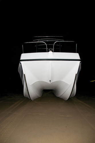 The hull produced a smooth and soft ride through the water and I could not get her to broach. Riding with the swell I trimmed the engines up a little bit and she handled it with ease. Against the swell I found she produced one of the softest rides of any boat I have been.