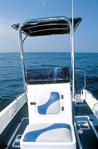 A bench seat with adjustable backrest has been fitted behind the console. This can be used as a forward or rear facing seat and dry storage. The stand-up centre console comes with a built-in seat in front and provides plenty of space for fuel storage. A small T-top has been fitted to give a bit of shade on those extra hot days.