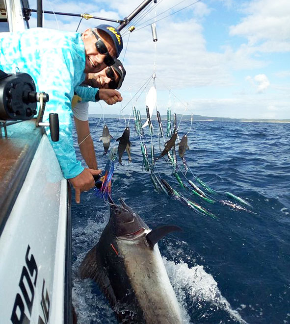 As a start, especially at venues like Sodwana Bay and Richards Bay, I would run three rigged lures from the outriggers in the traditional fashion with the dredge, and have one standby pitch rod with a bait ready. In Cape Verde our technique was that if we had a fish that came up lazy behind the lure or if a stripey came up behind the lure (which can sometimes be difficult to hookup), we would start teasing the fish in by pulling the lure in, deploying a pitch bait rod into position and getting the fish to switch from the lure onto a bait rigged with a circle hook.