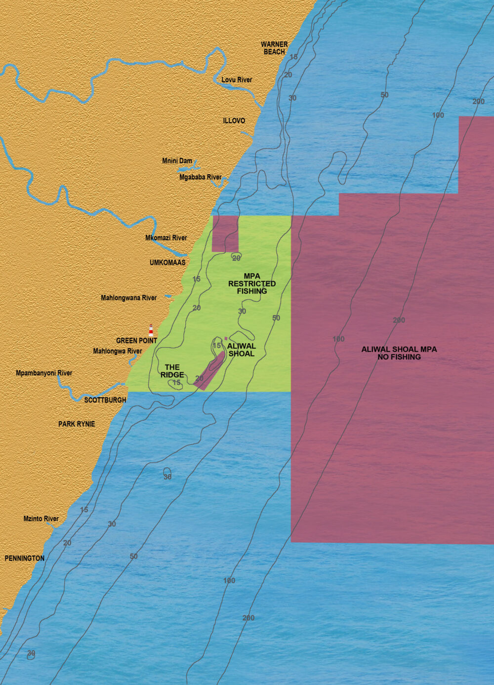 Also bear in mind that both Umkomaas and Scottburgh launch sites fall within MPA zones that have restrictions on what tackle you may launch with. This means that from those launch sites you may not launch with bottomfishing tackle on board even if you plan to fish outside the MPA.