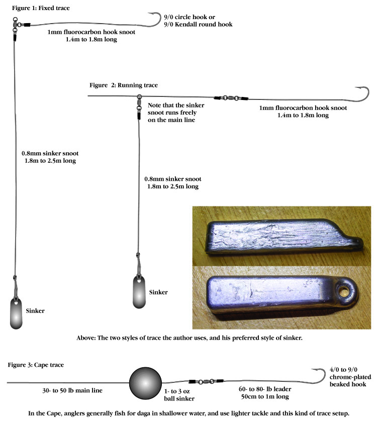 Fishing methods vary slightly, especially in the southern Cape where daga are generally targeted in shallower waters using a sliding sinker to a single hook with primarily squid/chokka and seekat pootjies (octopus tentacles) as bait, or else sardines or even a bomb bait of a mixture of both.