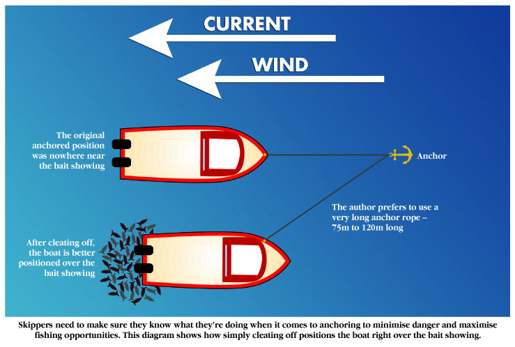 You will need to sound around your structure or wreck for the showing of fish, and you will notice that the showing of fish will rise a few metres off the bottom once it gets dark. You will need to be on the showing, or you are wasting your time, and you are going to “hold pole”, so the position of your anchor is critical.