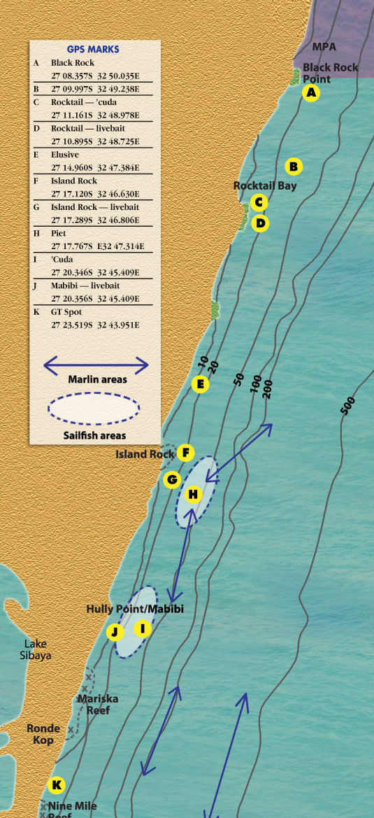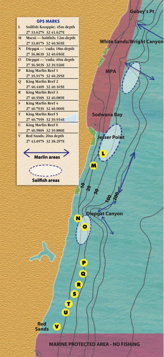 The best areas to try for them are in 35- to 45m of water. Sailfish are not bound to areas, and we tend to find them close to bait balls or shoals of bonnies, but during the winter months my first stop and working area for sailfish is Sailfish Knoppie, marked on the map alongside.